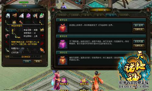 作为游戏的必备项目,作为为了拉充值而设置得超级豪华的首充礼包已经不是什么新鲜事,但若是能在充值买东西,拿首充礼包的同时,获得更多的奖励,一箭多雕,岂不是更爽?!要玩天地诸神中首充任务就是这么一个存在。玩家们只需花费6元宝(即6毛钱左右)购买商城的神佑幡,便可以完成任务获得奖励以及绝版橙色武器,还能领取价值888的首充大礼包,可谓一举多得。